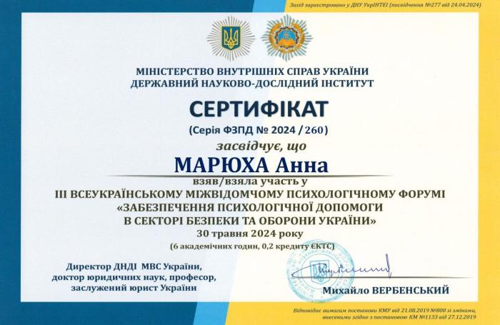Курсанти 2 курсу факультету № 3 Руслан Салогуб та Анна Марюха, які беруть активну участь у роботі відділення Юридичної клініки в м. Вінниця, долучилися до роботи ІІІ Всеукраїнського міжвідомчого психологічного форуму «Забезпечення психологічної допомоги в секторі безпеки і оборони України». Захід організував Державний науково-дослідний інститут МВС України за сприяння Департаменту освіти, науки та спорту МВС України, Управління психологічного забезпечення МВС України.