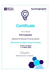 Старша викладачка кафедри іноземних мов факультету № 4 ХНУВС Вікторія Филипська відвідала вебінар «Becoming a teacher: beyond training» від British Council для педагогів, які займаються сприянням професійному розвитку інших. Спікер заходу підкреслив, що сучасне суспільство потребує не вузьких спеціалістів, а всебічно розвинених соціально активних особистостей, які мають фундаментальну наукову освіту та багату внутрішню культуру. Для будь-якого кваліфікованого спеціаліста необхідні не лише глибокі знання, а й особливо важливі професійно значущі особистісні якості. Учасники вебінару розглянули методи розширення традиційного підходу до педагогічної підготовки та розвитку професійних навичок.