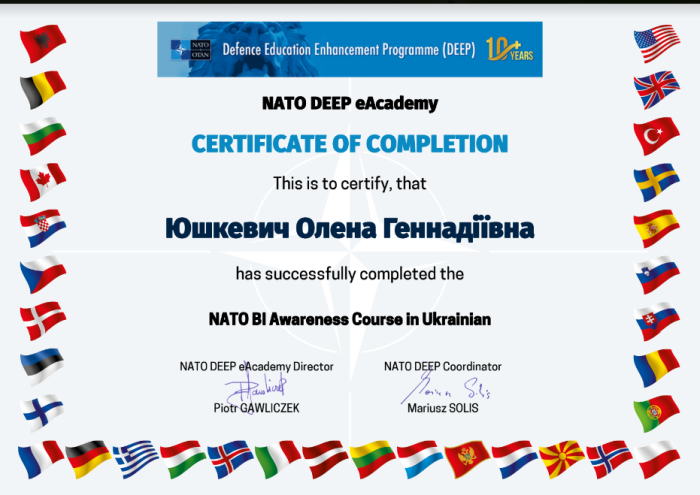 Доцентка кафедри теорії та історії держави і права факультету № 1 Олена Юшкевич разом із кураторською групою провела виховну годину, у межах якої курсанти пройшли онлайн-курс, розроблений експертами Програми НАТО щодо зміцнення доброчесності. Курс «NATO BI Awareness Course in Ukrainian» спрямований на підвищення обізнаності та розуміння принципів доброчесності серед представників оборонних структур та громадянського суспільства. Учасники ознайомилися з ключовими аспектами доброчесності, які є критичними для забезпечення ефективного та прозорого функціонування Сил безпеки і оборони. Курсанти отримали сертифікати про успішне проходження навчання, що підтверджують їхню обізнаність й готовність застосовувати набуті знання у практичній діяльності. Такі заходи надзвичайно корисні для здобувачів освіти, адже формують у них професійні навички, високі стандарти етики та доброчесності, необхідні для сучасних фахівців у сфері права та державного управління.