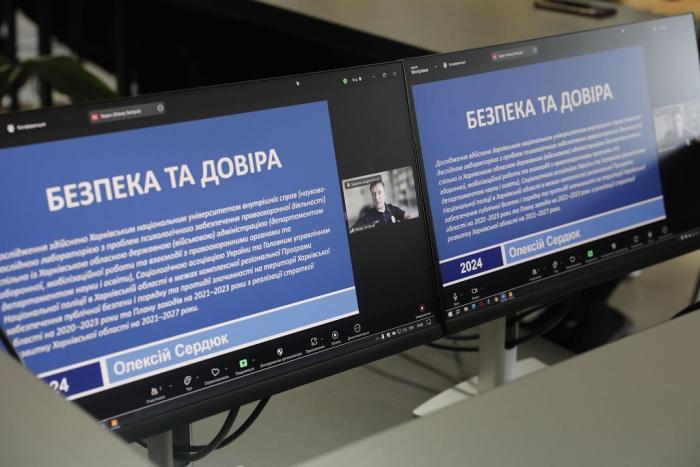 Олексій Сердюк, який є посадовою особою ХНУВС та виконує завдання і функції національного контактного пункту програми «Горизонт Європа» за напрямом «Цивільна безпека для суспільства», має значний досвід реалізації міжнародних проєктів у сфері соціологічного та психологічного моніторингу правоохоронної діяльності. Він представив основні результати соціологічного опитування «Безпека та довіра» – щорічного моніторингового дослідження, яке з 2013 року проводиться Харківським національним університетом внутрішніх справ спільно з Харківською обласною державною (військовою) адміністрацією, Соціологічною асоціацією України та Головним управлінням Національної поліції в Харківській області. Спікер детально розповів про особливості використання методики онлайн-опитування у науковій діяльності, продемонстрував результати опитування, що засвідчують позитивні зміни на рівні думки населення у сприйнятті рівня злочинності, побоювань злочинності, кількості небезпечних місць, відчутті безпеки, довіри до правоохоронних органів, ефективності поліції, готовності допомагати правоохоронним органам в умовах воєнного стану тощо. Проведені опитування також дозволили проаналізувати очікування населення від діяльності поліції в умовах воєнного стану.