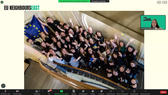 Захід відкрили Посли європейської молоді в Україні: Валерія Донець, Анастасія Одноволик і Дар’я Кордонова. Вони розповіли про мету та діяльність Послів європейської молоді в Україні. Вони розповіли про цілі та діяльність Послів європейської молоді в Україні. Ця європейська мережа об'єднує активних молодих людей віком від 16 до 26 років з Азербайджану, Вірменії, Грузії, Республіки Молдова, України та держав-членів Європейського Союзу з метою інформувати молодь про співпрацю між ЄС та країнами Східного партнерства, демонструвати результати цієї співпраці, сприяти політичному діалогу з різних тем, допомагати посилювати громадський активізм і співпрацювати заради кращого майбутнього.