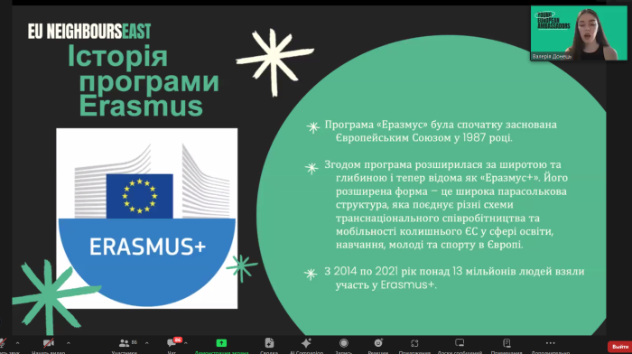 Спікерки детально розповіли про історію заснування програми Еразмус+, стажування та академічну мобільність у межах цієї програми, аплікаційний процес, висвітлили джерела, де шукати програми, ознайомили з перевагами, а також поділилися власним досвідом стажувань у межах програми Еразмус+.
