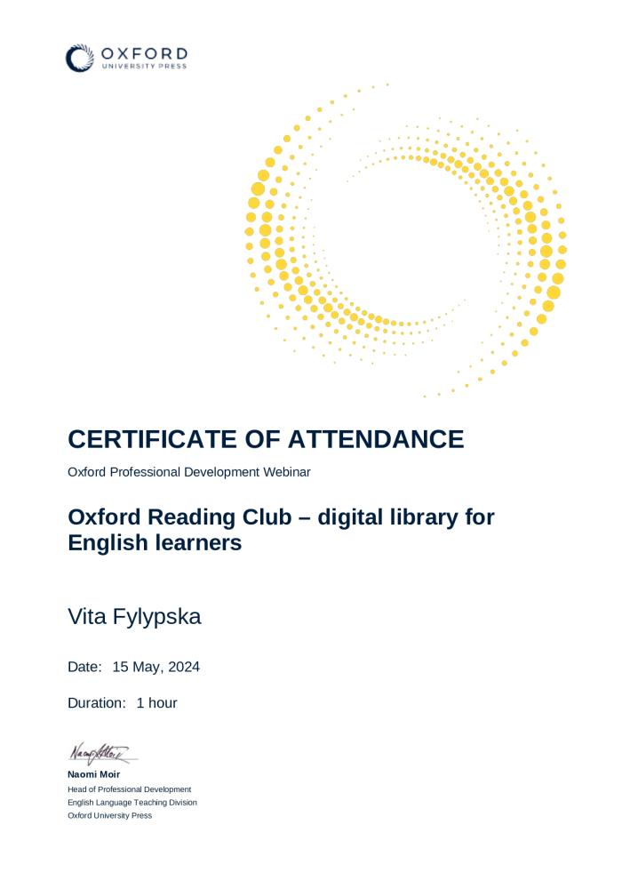Старша викладачка кафедри іноземних мов факультету № 4 ХНУВС Віта Филипська взяла участь у міжнародному вебінарі від Oxford University Press на тему: «Oxford Reading Club – digital library for English». Учасникам заходу розповіли про цифрову бібліотеку як інтегровану інформаційну систему, що дозволяє створювати, надійно зберігати та ефективно використовувати в процесі бібліотечного інформаційного обслуговування різнорідні електронні інформаційні ресурси, які локалізовані у самій системі та доступні через мережу «Інтернет». Під час вебінару було акцентовано увагу на перевагах цифрових бібліотек порівняно з традиційними: доступність, як правило, на безоплатній основі широкому колу користувачів; необмежений термін зберігання величезних масивів документів, переведених в електронну форму; висока інтегрованість інформаційного змісту з інструментами високошвидкісного пошуку. Викладачка університету ознайомилася з каталогом «Oxford Reading Club Library» та дізналася, як отримати доступ до цифрової бібліотеки, де знаходяться сотні електронних книг для людей різного віку та рівня володіння мовою.