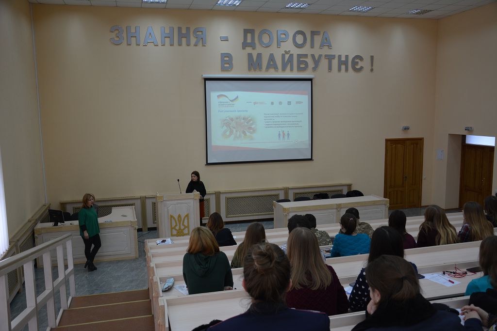 Керівник проекту Тетяна Покотило розповіла студентам та курсантам ХНУВС, які навчаються за спеціальністю «психологія» та «соціальна психологія» про ідею проекту та його завдання. Вона наголосила на тому, що особливістю Харківського регіону є велика концентрація категорій громад, які потребують фахової психосоціальної підтримки – вимушено переміщені особи, демобілізовані бійці АТО та члени їх родин. Тож важливого значення набуває об’єднання досвідчених і молодих фахівців для обміну досвідом та підвищення рівня професійної компетентності щодо надання соціально-психологічної підтримки людям, які опинилися у складній життєвій ситуації.