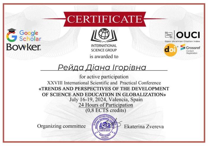 Курсанти другого курсу факультету № 1 Дмитро Мірошник, Діана Рейда під науковим керівництвом професора кафедри оперативно-розшукової діяльності та розкриття злочинів факультету № 2, кандидата юридичних наук, старшого наукового співробітника Олексія Деревягіна взяли участь у ХХVІІІ Міжнародній науково-практичній конференції «Trends and Perspectives of the Development of Science and Education in Globalization», яку провела Європейська організація науковців «International Science Group» (м. Валенсія, Іспанія). Курсанти виступили з тезами на тему «Використання інструментарію OSINT під час розслідування кримінальних правопорушень проти власності в умовах воєнного стану: аналіз інструментів PIPL, Wayback Machine та Cellebrite UFED».