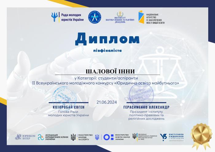Слухачка магістратури Сумської філії ХНУВС Інна Шалова увійшла до півфіналу ІІ Всеукраїнського молодіжного конкурсу «Юридична освіта майбутнього» та була відзначена дипломом. До конкурсу її підготувала наукова керівниця – доцентка кафедри гуманітарних дисциплін Юлія Самойлова. Захід проводили – Рада молодих юристів України, Інститут політико-правових та релігійних досліджень, Київська Мала академія наук учнівської молоді за сприяння Національного агентства із забезпечення якості вищої освіти, за підтримки Міністерства молоді та спорту України, Міністерства освіти і науки України.