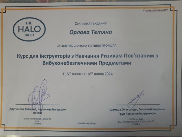 Представниці університету – доцентка кафедри криміналістики, судової експертології та домедичної підготовки факультету № 1 Тетяна Орлова та фахівчиня відділу рекрутингу та організації профорієнтаційної роботи Олександра Рябко пройшли курс «Навчання ризикам, пов’язаним із вибухонебезпечними предметами» від міжнародного оператора протимінної діяльності The Halo Trust. Вони успішно склали іспити та набули статусу сертифікованих інструкторів, що надає їм право навчати цивільне населення правилам безпечної поведінки з вибухонебезпечними предметами.