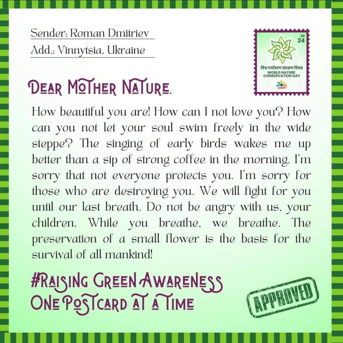 Глобальний конкурс листівок «Дорога матінка-природа» – це унікальна творча ініціатива Молодіжного клубу Удаан до Всесвітнього дня охорони природи, у якій беруть участь активні молоді люди з усього світу. Учасникам пропонувалося написати оригінальні, щирі послання природі, що відображають їхній особистий зв'язок із навколишнім середовищем та їхню прихильність до його збереження.