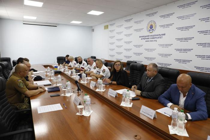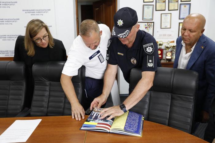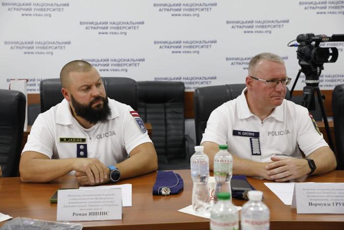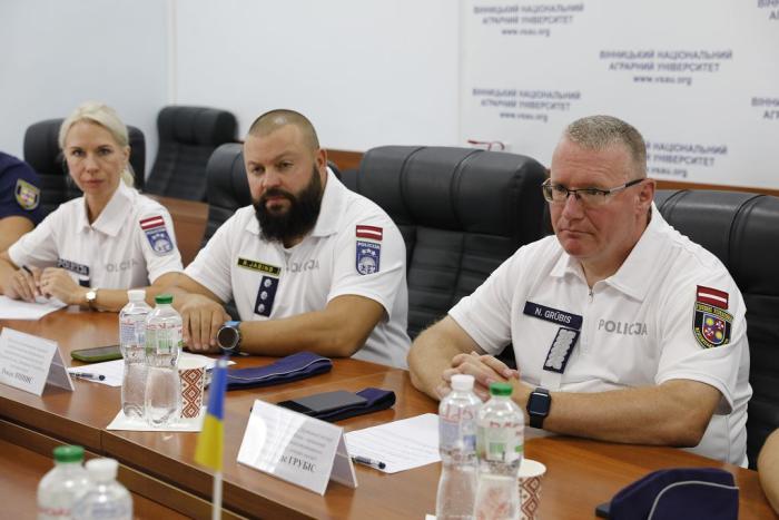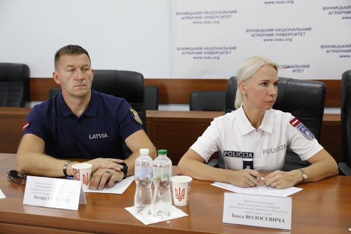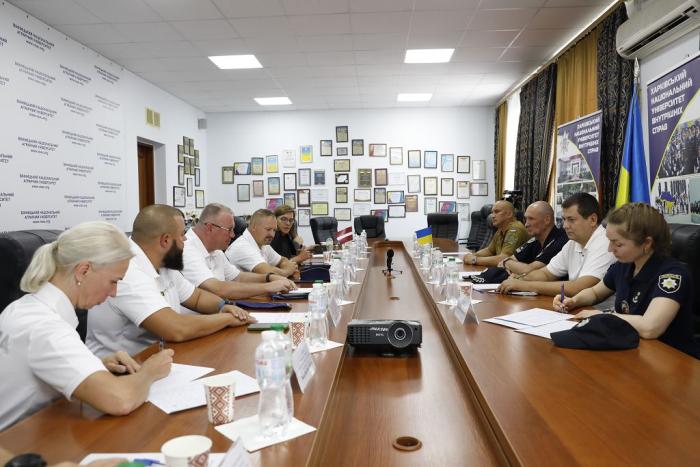 У складі латвійської делегації університет відвідали: Голова Державної поліції Латвійської Республіки генерал Армандс Рукс, заступник начальника Державної поліції Латвійської Республіки, начальник Центрального адміністративного департаменту Нормундс Грубіс, начальник Департаменту боротьби з кіберзлочинністю Центрального департаменту кримінальної поліції Державної поліції Латвійської Республіки Роман Яшинс, заступник начальника Центрального адміністративного департаменту Державної поліції Латвійської Республіки, начальник Департаменту забезпечення Інтарс Ополайс, заступник начальника Бюро внутрішнього контролю Державної поліції Латвійської Республіки Інеса Волосевича, Почесний консул Латвійської Республіки у м. Вінниця Ігор Скоромний, тимчасово повірена у справах Посольства Латвійської Республіки в Україні Мадара Сіліня, аташе з питань оборони полковник Александрс Холмановс.
