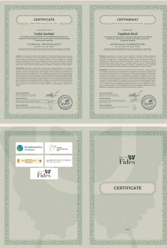 За результатами навчання учасники отримали такі загальні та фахові компетентності: здатності до критичного та системного мислення, логічного обґрунтування позиції, уміння конструктивно керувати емоціями, оцінювати ризики, приймати рішення, розв’язувати проблеми тощо. Фахові компетентності психологів були розширені у сфері сучасної психотерапії, патопсихології, психіатричної пропедевтики, клінічної психодіагностики, клінічної нейропсихології, психологічного онлайн-консультування. Окрім того вони опанували практичні навички з обрання та застосування валідних і надійних методів психологічної діагностики, практичної консультаційно-психотерапевтичної та психокорекційної роботи з використанням науково верифікованих методів і технік тощо.