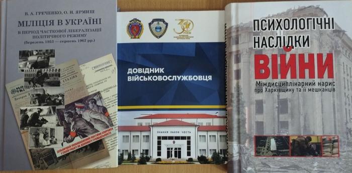 У фонд бібліотеки надійшли: «Психологічні наслідки війни: міждисциплінарний нарис про Харківщину та її мешканців», «Довідник військовослужбовця» та монографія «Міліція в Україні в період часткової лібералізації політичного режиму (березень 1953 – серпень 1962 рр.», яка є п’ятим томом багатотомного видання «Поліція/Міліція в Україні з XVIII століття і до сьогодення». Проблематика видань актуальна, має суттєве практичне значення і стане в нагоді науково-педагогічним працівникам, курсантам і студентам університету, а також практичним працівникам поліції.