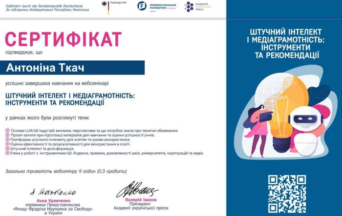 Вебсемінар «Штучний інтелект і медіаграмотність: інструменти та рекомендації», організатором якого виступила Академія української преси за підтримки «Фонду Фрідріха Науманна за Свободу», успішно пройшла студентка Сумської філії Антоніна Ткач, яка навчається на четвертому курсі за спеціальністю «Право».