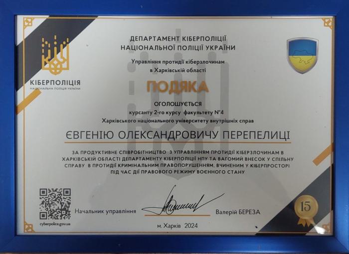 Їх отримали курсанти 3 курсу навчально-наукового інституту №4 Дмитро Курило та Євгеній Перепелиця за ефективне співробітництво з Управлінням протидії кіберзлочинам у Харківській області Департаменту кіберполіції НПУ та вагомий внесок у спільну справу в протидії кримінальним правопорушенням, вчиненим у кіберпросторі під час дії правового режиму воєнного стану.
