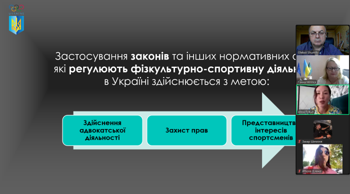 Зустріч була присвячена проблемам виокремлення такої новітньої галузі права, як спортивне право, і його місцю в системі права України. Випускниця Сумської філії Анна Рикун підготувала та виступила із презентацією: «Olympic_Lab “Чат із чемпіонами”». Вона надала визначення «Спортивного права», розповіла про коло законів та інших нормативних актів, що регулюють фізкультурно-спортивну діяльність в Україні. Окремо розглянули Закон України «Про фізичну культуру та спорт», який визначає загальні правові, організаційні, соціальні та економічні основи діяльності у сфері фізичної культури і спорту. Анна Рикун акцентувала увагу на державно-громадському управлінні сфери фізичної культури і спорту, проаналізувала його на міжнародному, національному та регіональному рівнях. Визначено було місце та роль Національного олімпійського комітету України, який об'єднує 40 федерацій з олімпійських видів спорту, як одних із суб'єктів олімпійського руху. До них належать федерації видів спорту, визнані МОК, і фізкультурно-спортивні товариства та відомства.