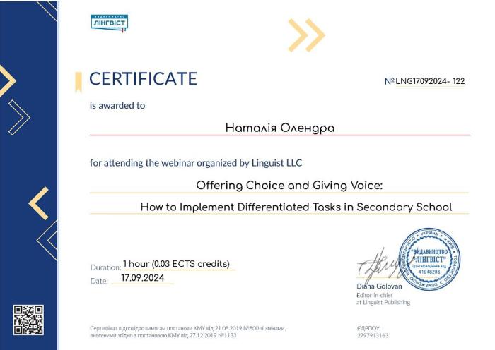 Старші викладачки кафедри мовної підготовки Харківського національного університету внутрішніх справ Наталія Олендра та Лариса Сазанова відвідали міжнародний онлайн-вебінар «Offering Choice and Giving Voice: How to Implement Differentiated Tasks in Secondary School», організований та проведений Linguist LLC. На заході розглядали питання щодо того, як замінити універсальні методи навчання та створити більш ефективне навчальне середовище для студентів на заняттях англійської мови. Було запропоновано практичні стратегії виконання диференційованих завдань, які дають змогу здобувачам освіти обирати власні шляхи навчання та висловлювати свої думки.