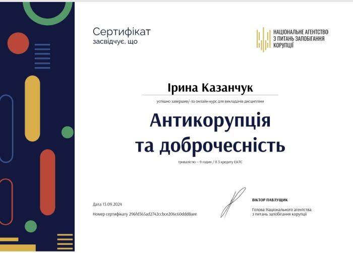 За результатами проходження курсів та успішного виконання тестових завдань Ірина Казанчук отримала сертифікати з підвищення кваліфікації.