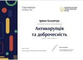 Доцентка кафедри адміністративного права та процесу ННІ №3, кандидатка юридичних наук, професорка Ірина Казанчук взяла участь у навчальних онлайн-курсах з дисциплін «Антикорупція та доброчесність» та «Основи антикорупції для всіх та кожного», організованих Національним агентством з питань запобігання корупції.