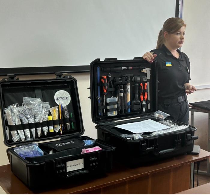 Поліцейська навела приклади зі своєї практичної діяльності, розповіла про специфіку проведення ідентифікаційних досліджень біологічних матеріалів, що залишаються на місці вчинення кримінальних правопорушень, зокрема воєнних злочинів. Наталія Тодоровська продемонструвала курсантам можливості використання різних видів слідчих валіз, особливості застосування криміналістичних методів фіксації злочинної діяльності за допомогою фотографії та відеозапису під час роботи поліції в польових умовах.