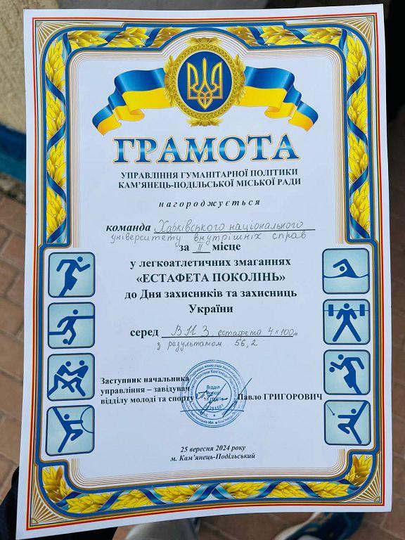 До Дня захисників і захисниць України двадцять команд закладів вищої освіти з Хмельниччини взяли участь у легкоатлетичній естафеті 4х100 метрів. Збірна команда Харківського національного університету внутрішніх справ із легкої атлетики посіла ІІ загальнокомандне місце. Команду представили здобувачі вищої освіти ННІ №1-4: Захар Євреїмов, Іван Ухов, Юлія Мельник та Анастасія Штанько.