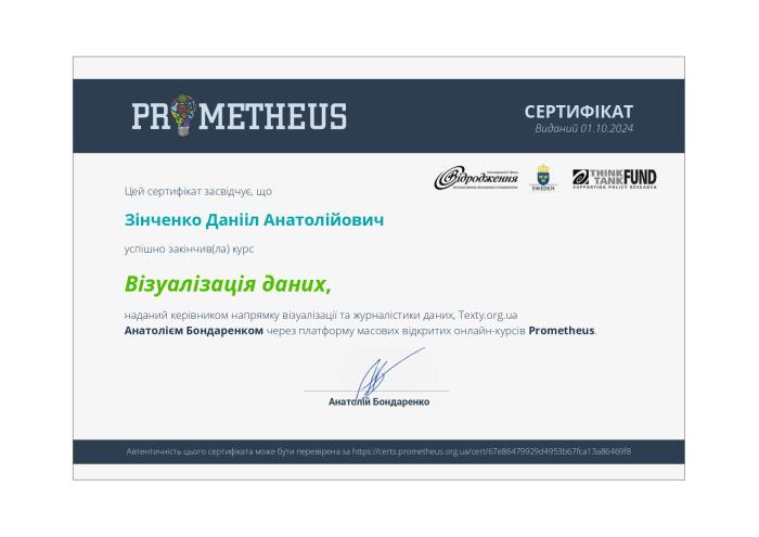 Начальник відділу аспірантури (ад'юнктури) і докторантури Володимир Іванцов та ад'юнкт цього ж відділу Данііл Зінченко пройшли навчання на тему «Візуалізація даних» на платформі Prometheus. Курс охоплював ключові аспекти сучасних підходів до обробки та представлення інформації. Після складання фінального іспиту учасники отримали сертифікати, що підтверджують їхню кваліфікацію у цій галузі. Це дозволить більш ефективно застосовувати отримані знання у науково-дослідній діяльності та сприяти вдосконаленню освітнього процесу в університеті.