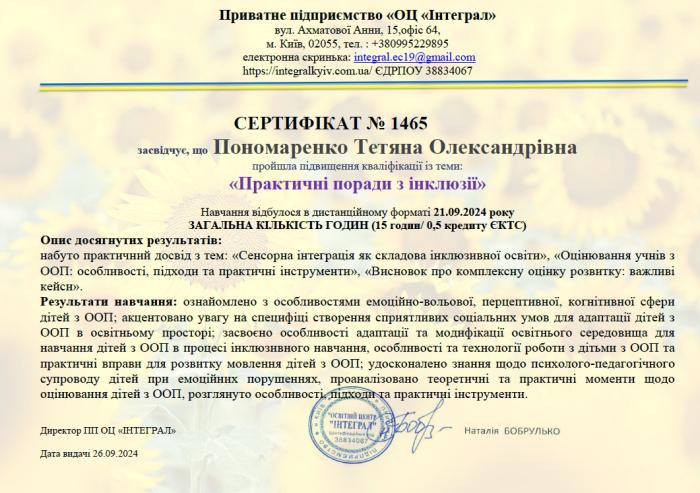 Доцентка кафедри гуманітарних дисциплін Сумської філії ХНУВС Тетяна Пономаренко пройшла курс «Практичні поради з інклюзії». Вона отримала знання за темами: «Сенсорна інтеграція як складова інклюзивної освіти», «Оцінювання учнів з особливими освітніми потребами (ООП): особливості, підходи та практичні інструменти», «Висновок про комплексну оцінку розвитку: важливі кейси», «Модифікації освітнього середовища для навчання дітей з ООП у процесі інклюзивного навчання» та засвоїла технології роботи та практичні вправи з дітьми з ООП.