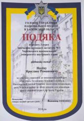 За сумлінне ставлення до виконання службових обов'язків, досягнення позитивних результатів у роботі щодо збору доказів для доведення факту збройної агресії рф проти України подяки від начальника ГУНП в Харківській області Володимира Тимошка здобувачам вищої освіти 3 курсу Ярославу Несен і Віолеті Шомаховій вручив директор ННІ №1 Віталій Романюк.