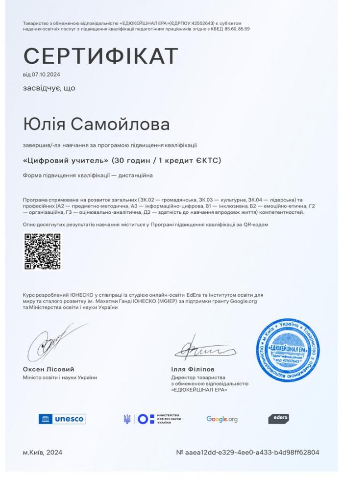 Професорка кафедри гуманітарних дисциплін Сумської філії ХНУВС Юлія Самойлова пройшла курс навчання «Впровадження нових методик у цифровому освітньому середовищі» на платформі онлайн-освіти EdEra. Програма розроблена ЮНЕСКО у співпраці з Інститутом освіти для миру і сталого розвитку ім. Махатми Ганді ЮНЕСКО (MGIEP) за підтримки Міністерства освіти і науки України.