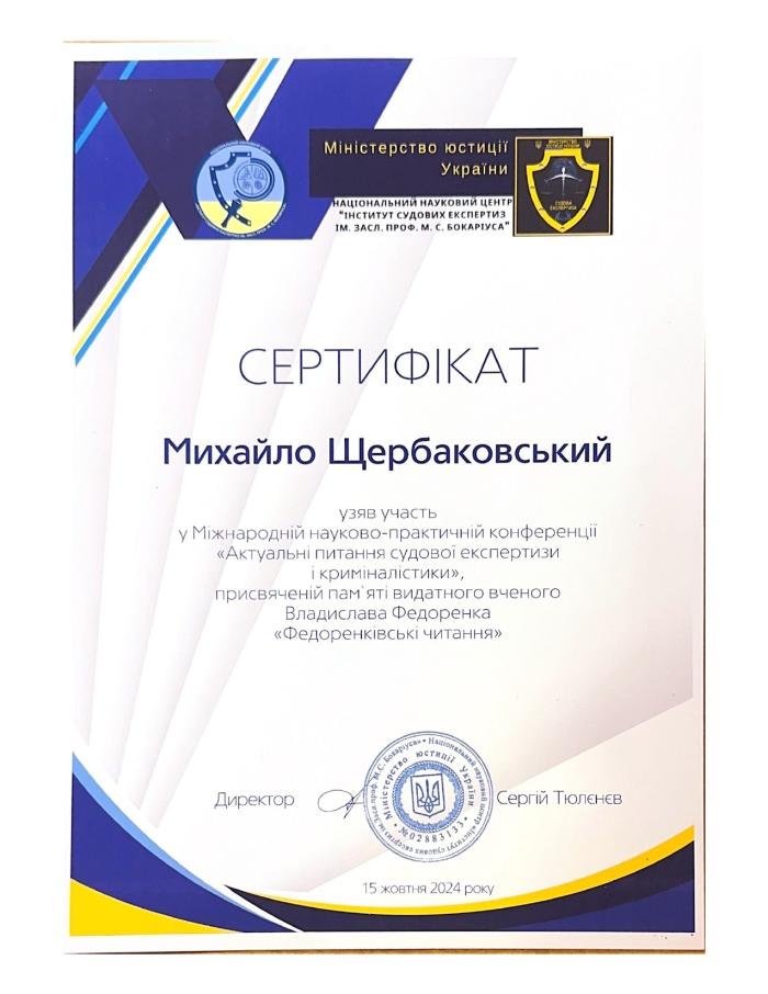 Завідувач кафедри кримінального процесу, криміналістики та експретології ННІ №5, доктор юридичних наук, професор Михайло Щербаковський взяв участь у масштабному науковому заході за темою «Актуальні питання судової експертизи і криміналістики», який організував та провів Національний науковий центр «Інститут судових експертиз ім. Засл. проф. М.С. Бокаріуса». До науково-практичної конференції долучилися понад 170 науковців, судових експертів, криміналістів і правників з України, Молдови, Вірменії, Ізраїлю, Чорногорії, Угорщини.