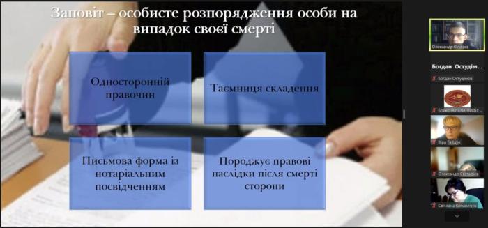 Особливу увагу під час заходу було приділено питанням дії спадкового законодавства у часі та їх застосування у період воєнного стану, правової природи заповіту, особливостям розгляду судами справ про визнання заповітів недійсними.