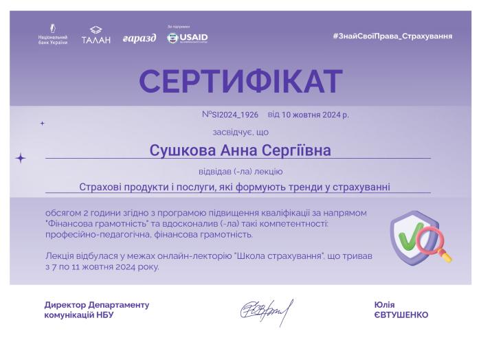 У межах всеукраїнської інформаційно-просвітницької кампанії «Знай свої права: страхування» старша викладачка кафедри правового забезпечення підприємницької діяльності та фінансової безпеки ННІ №5 Анна Сушкова і слухач магістратури спеціальності «Фінанси, банківська справа, страхування та фондові ринки» Сергій П’янов прослухали лекцію «Школа страхування». Організаторами заходу виступили Центр фінансових знань «Талан» і Національний банк України за підтримки Проєкту USAID «Інвестиції для стійкості бізнесу».