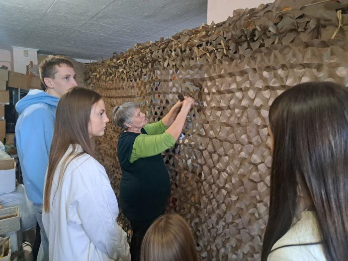 Представники Благодійного фонду показали студентам основи плетіння, щоб сітка виглядала природно й добре маскувала техніку та позиції на передовій. Разом було виготовлено захисну сітку для бійців Курського напрямку.