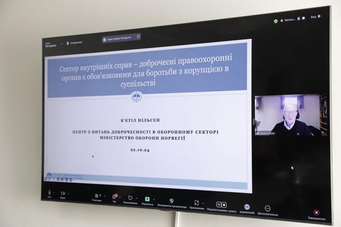 До дискусії долучилися представники міжнародних організацій, серед яких спеціальний радник Центру з питань доброчесності в оборонному секторі Міністерства оборони Норвегії Кетіль Нільсен, Національний радник з урядування і реформ у секторі безпеки Женевського центру урядування у секторі безпеки Дмитро Євдокимов та експерт з питань боротьби з корупцією Консультативної місії Європейського Союзу в Україні Богдан Шапка. До роботи круглого столу також долучився заступник начальника УЗК МВС України Сергій Яременко, який презентував учасникам деякі аспекти реалізації антикорупційної політики Міністерства внутрішніх справ. У своїй доповіді він окреслив основні напрями роботи МВС у цій сфері, акцентуючи увагу на важливості координації з іншими державними органами та громадськістю для ефективного запобігання корупційним проявам.