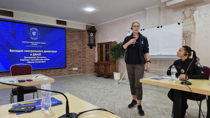 Під час навчальних сесій першого дня тренінгу Анет Швіцке та Юлія Петрова розглянули ключові аспекти дискримінації за ознакою статі та сексуальних домагань, особливості протидії домаганням на індивідуальному рівні та в колективі, міжнародні нормативно-правові акти, спрямовані на запобігання та боротьбу із зазначеним правопорушенням. Джеорджина Магнуссен детально розповіла про належні практики та поділилась особистим досвідом у боротьбі з дискримінацією та домаганнями в правоохоронних органах Данії.