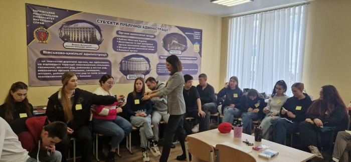 Психолог відділення психологічного забезпечення відділу кадрового забезпечення Вікторія Горєлова провела заняття з елементами тренінгу для здобувачів вищої освіти першого курсу навчально-наукового інституту № 5 (спеціальність 262 «Правоохоронна діяльність») за темою «Розвиток комунікативних вмінь та навичок вирішення конфліктів мирним шляхом».