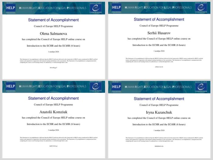 Науково-педагогічний склад кафедри адміністративного права та процесу ННІ №3 з метою покращення професійних компетентностей взяв онлайн участь в освітньому курсі на платформі HELP «Introduction to the ECHR and the ECtHR» (Вступ до ЄКПЛ та ЄСПЛ), присвяченому черговій річниці утворення Європейського Союзу. Навчання розроблене Програмою Ради Європи HELP у співпраці з Департаментом з питань виконання рішень Європейського суду з прав людини Ради Європи.