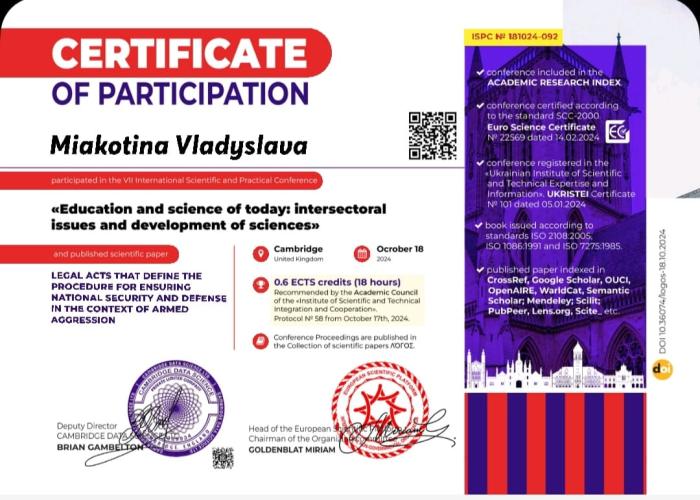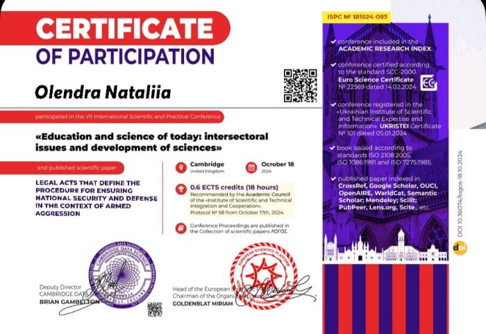 Старша викладачка кафедри мовної підготовки ХНУВС Наталія Олендра та курсантка третього курсу ННІ №4 Владислава М’якотіна взяли участь у VII міжнародній науково-практичній конференції «Education and science today: intersectoral issues and development of sciences» (м. Кембридж, Великобританія). Вони представили статтю «Legal acts that define the procedure for ensuring national security and defense in the context of armed aggression», в якій розглянули нормативно-правове забезпечення державної політики національної безпеки і оборони України в умовах дії правового режиму воєнного стану.