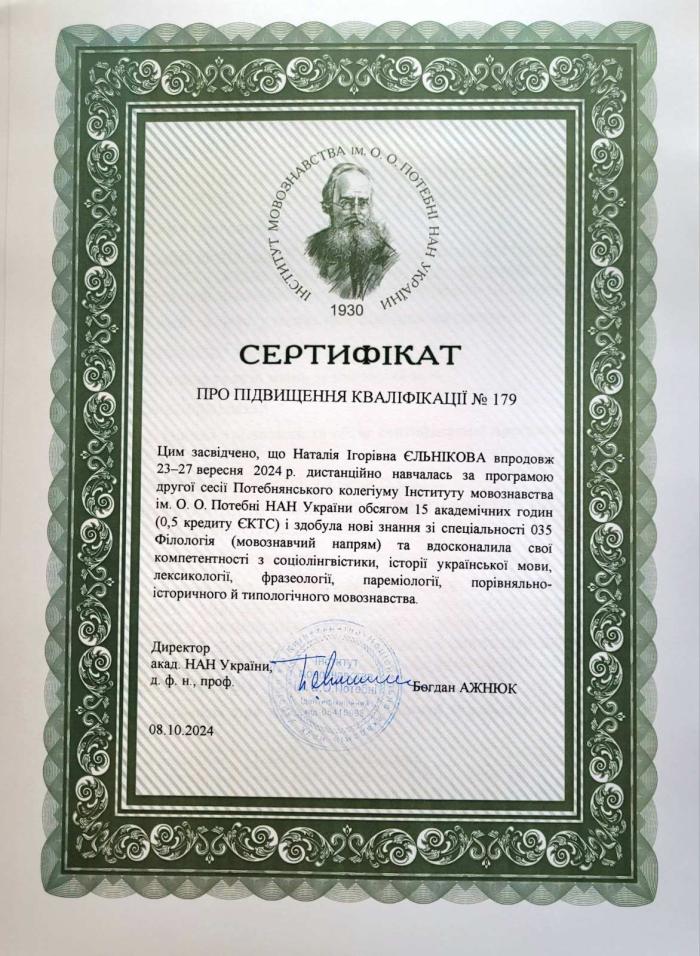 Після завершення освітнього курсу лінгвістичної школи «Потебнянський колегіум» Наталія Єльнікова отримала сертифікат підвищення кваліфікації.