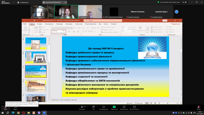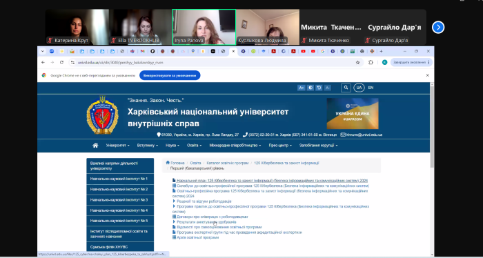 Заступниця директора ННІ №5 Елла Твердохліб та завідувачка кафедри правоохоронної діяльності Ірина Панова провели онлайн-зустріч на тему вступної компанії 2025 року з керівництвом та учнями випускних класів низки шкіл Харківщини: Харківські гімназії №№ 67, 86, 136; комунальні заклади «Харківські ліцеї Харківської міської ради» №№13, 18, 57, 69, 87, 108, 126, 152.