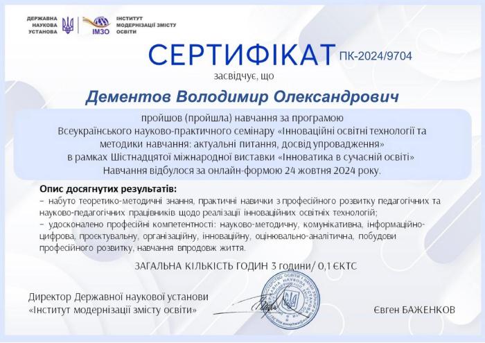 Доцент кафедри соціально-економічних дисциплін Сумської філії ХНУВС Володимир Дементов взяв участь у Всеукраїнському науково-практичному семінарі «Інноваційні освітні технології та методики навчання:актуальні питання, досвід упровадження», що відбувся у межах Шістнадцятої міжнародної виставки «Інноватика в сучасній освіті», організатором якого виступила Державна наукова установа «Інститут модернізації змісту освіти». До участі у семінарі були запрошені представники органів управління освітою, закладів післядипломної педагогічної освіти, центрів професійного розвитку педагогічних працівників, викладачі закладів вищої освіти, фахової передвищої та професійної (професійно-технічної) освіти, вчителі закладів загальної середньої освіти, науковці, аспіранти тощо.