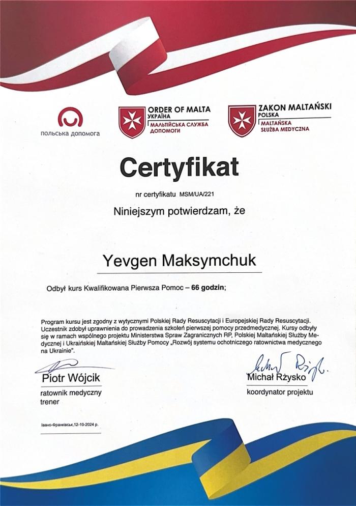 Здобувач освіти 3 курсу ННІ №4 Євген Максимчук пройшов навчання з надання домедичної допомоги у м. Івано-Франківськ за участі представників Мальтійської служби допомоги (Республіка Польща). Євген є волонтером цієї організації і вважає, що в обраній ним професії навички надання першої допомоги вкрай необхідні, особливо під час дії правового режиму воєнного стану. Ці знання допоможуть зберегти не одне життя. Отриманий сертифікат надає можливість використовувати здобуті знання не лише в Україні, а й в інших країнах Європи.