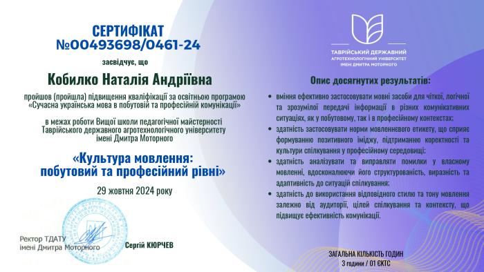 Доцентка кафедри гуманітарних дисциплін та українознавства, кандидатка філологічних наук Наталія Кобилко взяла участь у підвищенні кваліфікації за освітньою програмою «Сучасна українська мова в побутовій та професійній комунікації» на базі Таврійського державного агротехнологічного університету імені Дмитра Моторного.