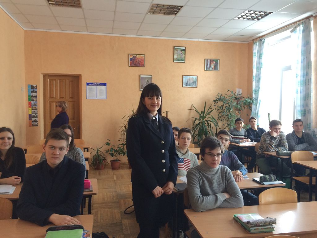 Викладач кафедри трудового та господарського права Харківського національного університету внутрішніх справ майор поліції Олена Кісіль зустрілася з учнями 10 та 11 класів Харківської гімназії № 116. Вона розповіла їм про умови вступу та переваги навчання в ХНУВС, спеціальності за якими готують майбутніх фахівців, роботу наукових гуртків, спортивних секцій, гуртків художньої самодіяльності та підготовчі курси.