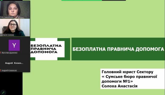 За такою темою головна юристка сектору «Сумське бюро правничої допомоги №1» Анастасія Солоха разом із професоркою кафедри гуманітарних дисциплін Юлією Самойловою провели бінарне заняття для слухачів магістратури з дисципліни «Іноземна мова за професійним спрямуванням».