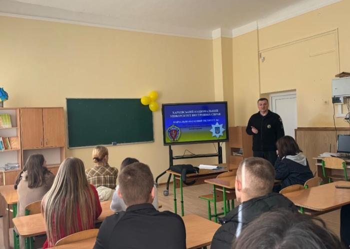 Доцент кафедри кримінального права і кримінології ННІ №1 ХНУВС Ярослав Лизогуб зустрівся з керівництвом та учнями 11 класів Хотинського академічного ліцею №5 Хотинської міської ради Чернівецької області. Під час зустрічі він розповів про умови вступу до університету, про навчально-наукові інститути та спеціальності, за якими готують фахівців. Ярослав Лізогуб повідомив, що на порталі НПУ для кандидатів на навчання за державним замовленням https://osvita.np.gov.ua/ розпочато реєстрацію для заповнення анкет кандидата на навчання у ЗВО із специфічними умовами навчання, що здійснюють підготовку поліцейських.