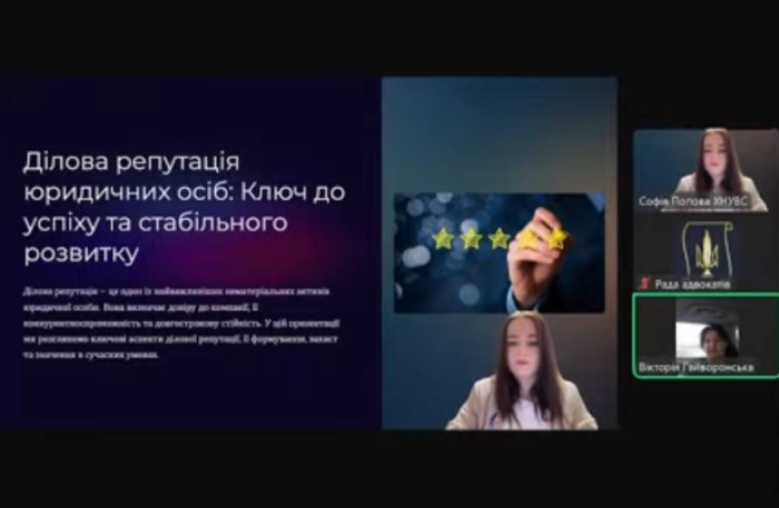 За такою темою науково-практичний захід із підвищення кваліфікації для адвокатів Харківської області провела старша викладачка кафедри цивільного права та процесу навчально-наукового інституту №5, докторка філософії у галузі «Право» Софія Попова. Вона розповіла адвокатам про особливості здійснення та захисту особистого немайнового права на недоторканність ділової репутації юридичних осіб, зокрема під час дії правового режиму військового стану.