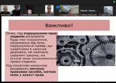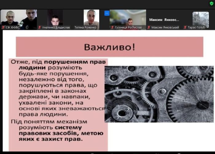 Доцентки кафедри гуманітарних дисциплін Надія Демиденко та Ганна Довгополова спільно з курсантами 3 курсу Сумської філії ХНУВС Андрієм Левченком і Нікітою Капітоненком обговорили з учнями Сумської спеціалізованої школи І-ІІІ ступенів №25 м. Суми поняття порушення прав людини, основні механізми їх захисту та кореляцію національних, міжнародних та європейських стандартів захисту прав людини в контексті євроінтеграції.