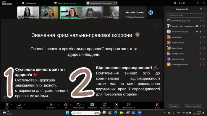 Засідання провів доцент кафедри, кандидат юридичних наук, доцент Ярослав Лантінов. Із доповідями виступили: доцент кафедри, кандидат юридичних наук, доцент Юрій Вапсва про кримiнально-правову протидiю корупцii, А. О. Липницька про кримінально-правову протидiю насильству, кандидат юридичних наук, доцент Ярослав Лантінов про особливостi наукового свiтосприйняття. Учасники засідання обговорили стан пiдготовки тез доповiдей.