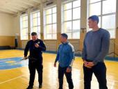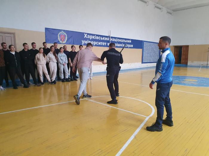 Патрульний розповів про власний практичний досвід щодо затримання правопорушників, а також детально розкрив питання щодо правомірності застосування поліцейських заходів примусу. Курсанти відпрацювали тактику дій під час затримання правопорушника, озброєного ножем і в обмеженому просторі.