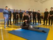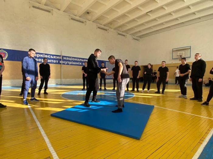 Для курсантів ННІ №2 заняття за темою «Больові прийоми та способи затримання» провели інспектор сектору реагування патрульної поліції Чугуївського РУП ГУНП у Харківській області Ярослав Кизим і викладач кафедри спеціальної фізичної підготовки ННІ №2 Антон Черніков. Курсантам продемонстрували проведення затримання правопорушників під час підходу ззаду, збоку важелем руки назовні, подальшим проведенням поверхневої перевірки затриманої особи.
