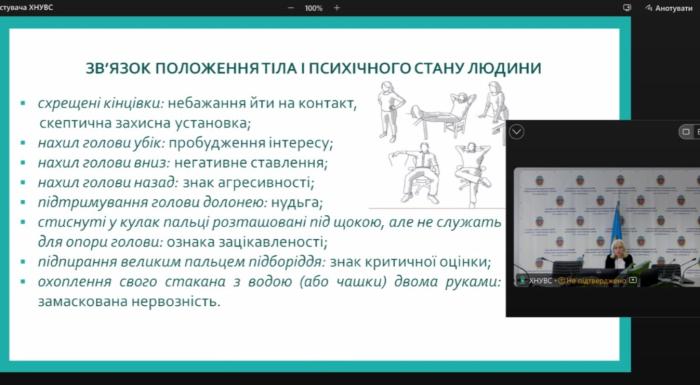 Завідувачка кафедри психології, соціології та педагогіки ННІ №3, докторка педагогічних наук, професорка Олена Федоренко провела лекційне заняття на тему «Застосування методів візуальної діагностики невербальної поведінки опитуваних осіб під час проведення службових розслідувань». Професорка університету надала актуальну наукову інформацію з питань застосування методів візуальної психодіагностики для вивчення особливостей прояву міміки, жестів, зовнішніх поведінкових реакцій, положення тіла, мови та мовлення опитуваних осіб, стосовно яких проводять службові розслідування задля з’ясування правдивості наданої ними інформації.
